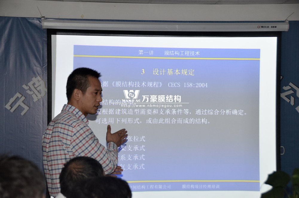 作為膜結構專家張總詳細的講解了膜結構的發展史和膜結構的應用領域,以及膜材的特性等等知識,加深了員工的專業知識。
