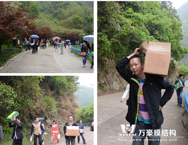 經(jīng)過1個(gè)多小時(shí)的車程,到達(dá)四明山的腳下,男同事開始搬運(yùn)中午的美食上山了!