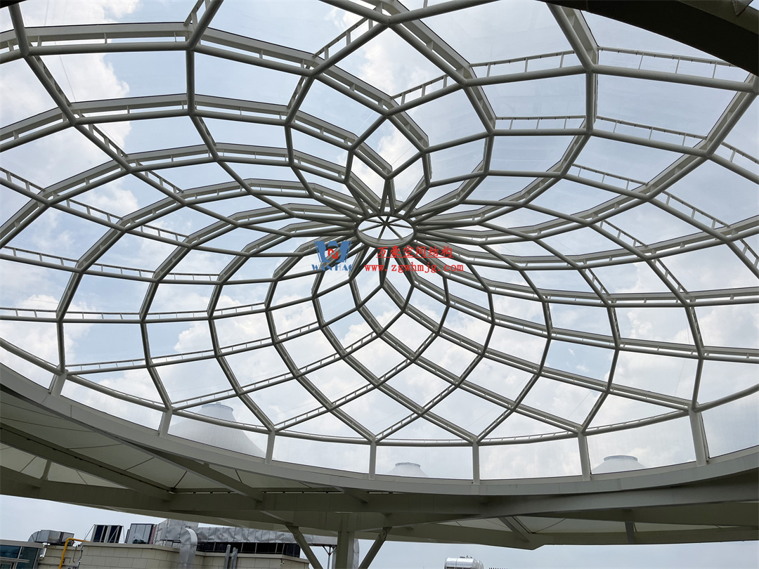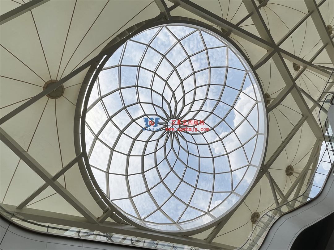 3、適應(yīng)大跨度:膜結(jié)構(gòu)材質(zhì)輕,適合大跨度的建筑設(shè)計。在大型商業(yè)街區(qū)中,常常需要建造開闊的空間,膜結(jié)構(gòu)穹頂能夠輕松滿足這一需求,無需過多的支撐結(jié)構(gòu),使空間更加開闊、通透。