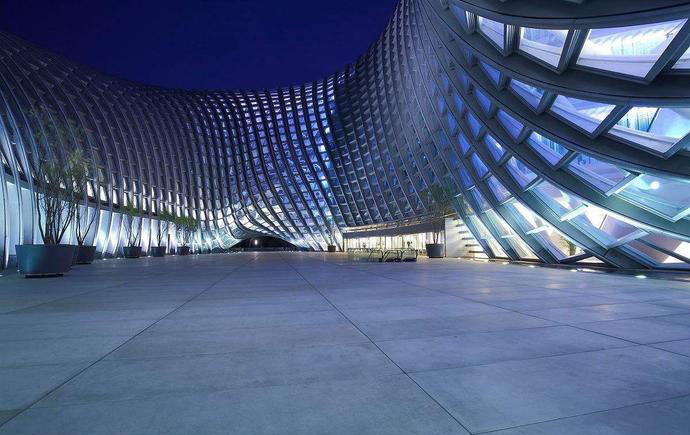 幕墻、結構外殼一體化的設計概念,將張拉膜結構建筑表皮形式、結構和材料構造進行高度的設計整合。它們的界限在創(chuàng)作中實現(xiàn)融合,表皮既是結構,結構也是裝飾,鋼構件、鋁板、幕墻玻璃被技巧性地塑造成一個流暢的張拉膜結構建筑曲面。