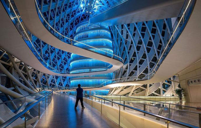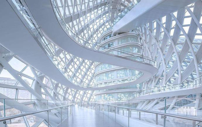 整個莫比烏斯環(huán)的幕墻由4943塊完全不同的玻璃組成,懸掛在“沒有一條是直的”的鋼梁之下。為了表現(xiàn)莫比烏斯環(huán)連續(xù)扭動的形體特征,設計團隊打造出了一套融合結構力學和美學表現(xiàn)力的全新結構體系——雙向疊合網(wǎng)格結構。