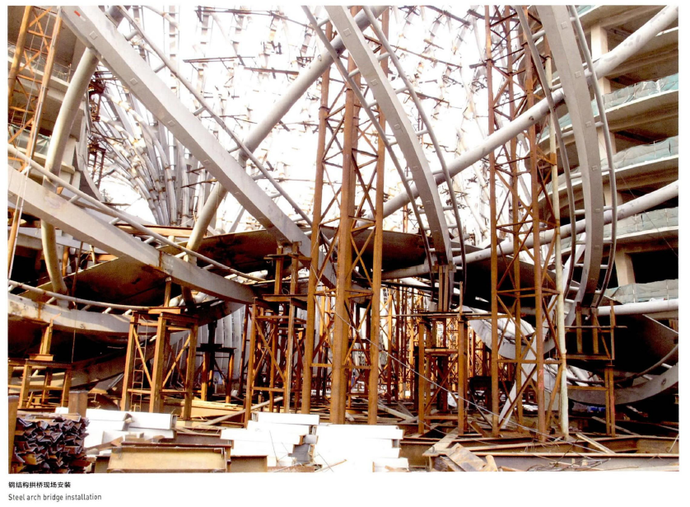 “夢之橋”在設計施工中的名稱比較low,叫做“環(huán)形坡道”。在鳳凰中心項目的設計中,全長252米的環(huán)形坡道從7米標高爬升到19.6米高的裙房四層。為了實現(xiàn)凌空飛起的視覺效果,工程師設計了上有拉索,下有暗撐的巧妙結構,利用最簡單的三角形支撐結構在張拉膜結構建筑螺旋狀的鋼結構立場上尋找著力點。