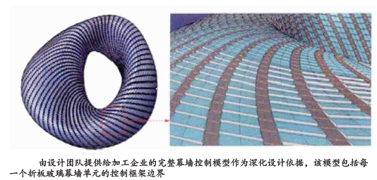 裙房內(nèi)幕墻初始的控制面由復雜的雙曲面構成。為了能在造價允許范圍內(nèi)高質(zhì)量完成設計控制工作,依靠BIM模型的高精準性,設計師們對原始的雙曲面進行了板片優(yōu)化的數(shù)據(jù)分析,確定了板片優(yōu)化的模數(shù)設置、板片平面外偏差的消納規(guī)則,最終建立起完整的干掛SRC板材幕墻體系模型,用以直接指導后續(xù)的生產(chǎn)加工和安裝工作。