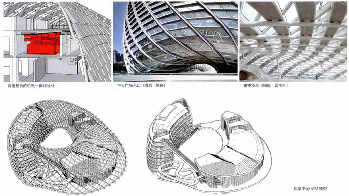 在這個設計中,“莫比烏斯環(huán)”的構思源自“鳳凰”的形象,莫比烏斯環(huán)數(shù)學模型的最大特點是“有界無邊”,消除了傳統(tǒng)建筑中的“正交”概念,所有曲線在360°的空間中連續(xù)循環(huán),通過一個連續(xù)的、不斷變化的曲面將高聳的辦公樓和低矮的演播樓統(tǒng)一成一個封閉的整體。