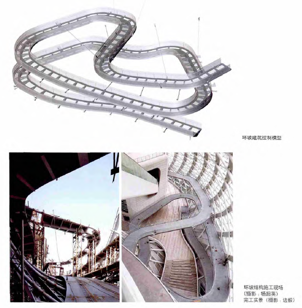 在爬升過程中,“夢之橋”先后與外殼鋼結構、主樓及裙房混凝土結構產(chǎn)生搭接關系,同時還要保證環(huán)坡的外型優(yōu)美流暢。