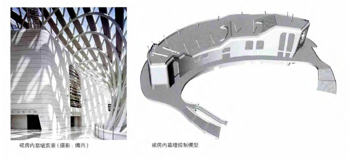 走進這座張拉膜結構建筑,斜向鋼柱形成的韻律在環(huán)形坡道映襯下產(chǎn)生了強烈的音樂感。兩柱之間的玻璃幕墻設計成漸變的平板玻璃箱體,插接組合準確,層層疊疊,晶瑩剔透,而在底層入口處的大門洞立面玻璃箱體轉成吊頂。走進其中,周圍的幕墻鋼構弧線順坡而下,向中心匯聚。曲面玻璃和墻板界面的順暢圓滑,板縫的連貫順直,各種設備口部的整合和控制等等都完美地契合在一起。