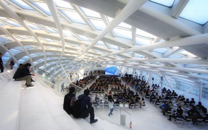 這種“令人捏了一把汗”的設計貫穿在鳳凰中心設計始終。“夢之橋”連接的是演播廳和一個樓頂空間。當大樓設計完成,“樓頂”開闊的地板被連續(xù)的莫比烏斯環(huán)外殼覆蓋。設計師靈光一閃,決定將這里設計成一個完全對外的開放區(qū)域,創(chuàng)造全新的交流場所,取名“樓外樓”。