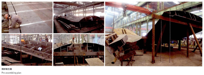 彎扭板材只是完成了第一步,更大的挑戰(zhàn)在于如何將這些板材拼接在一起,“精度”和“進度”成為了加工方的雙重挑戰(zhàn)。以造船技術為基礎,加工方制作了“樣箱”。