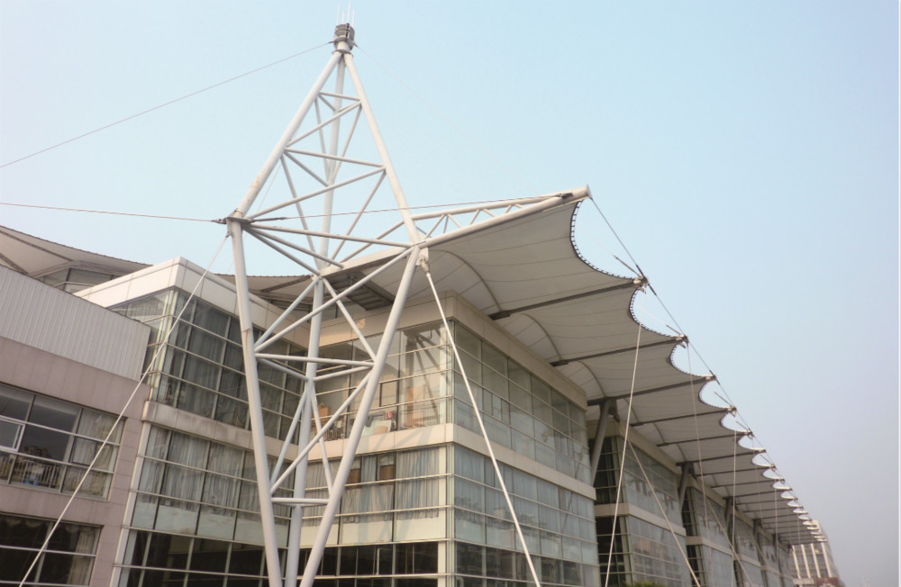 屋面膜結構建筑所采用的膜材具有卓越的阻燃性和耐高溫性,故能很好的滿足防火要求。由于屋面膜結構自重輕,又為柔性結構且有較大變形能力,故抗震性能好。