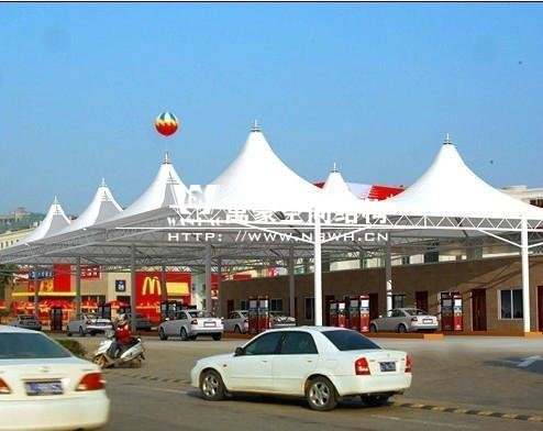 膜結構建筑因其獨特的藝術性,優美的造型,濃郁的現代氣息,被廣泛運用到建筑領域的各種設施。加油站膜結構運用在加油站頂蓬上是再合理不過的選擇,因為加油站的頂篷是公路或地區設置名稱標牌的主要位置,是公路或地區的重要標志;大跨度的膜結構在這種場合下的運用,能充分體現膜結構的主要特點,并有較好的標識招攬效果。為相關的道路或區域起到畫龍點睛的作用。
