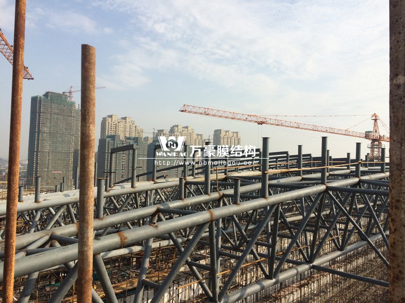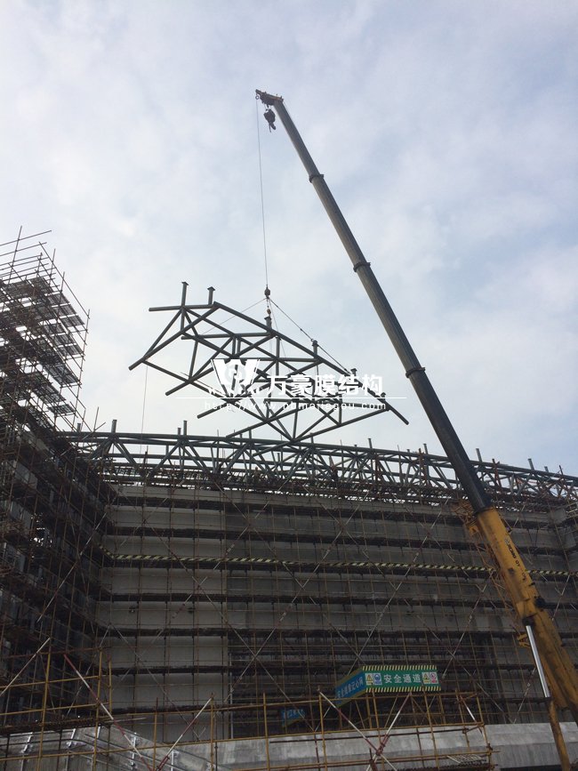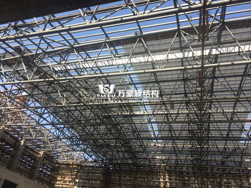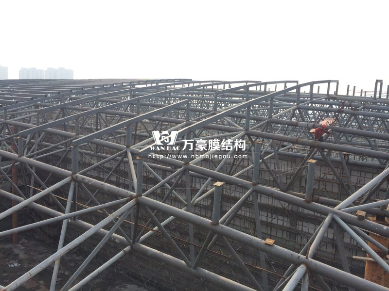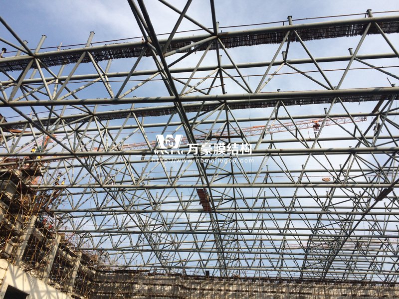 上圖為體育館項目鋼結構現場施工照片,主體結構為三角管桁架結構。