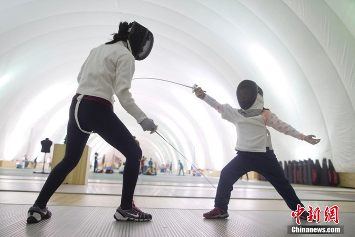 12月1日,一位學生在北京市某學校充氣膜體育館學習擊劍。11月29日空氣重污染橙色預警;11月30日霾橙色預警;12月1日大霧橙色預警。北京史上首次三個預警全“橙”發(fā)送。截至昨日,今年最嚴重空氣污染過程已持續(xù)了5天。昨夜,冷空氣抵達北京,霧霾逐漸消散。今起至4日,京城空氣優(yōu)良。昨日24時,市空氣重污染應急指揮部解除北京空氣重污染橙色預警。 (來自:中國新聞網(wǎng))