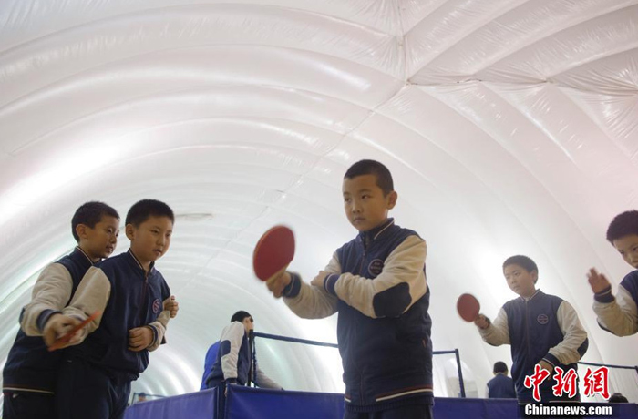 12月1日,一群學生在北京市某學校充氣膜結(jié)構(gòu)體育館學習乒乓球。該體育館的PM2.5過濾系統(tǒng)能夠過濾輸入室內(nèi)的空氣,過濾后的空氣通過風道輸送至充氣膜內(nèi)。充氣膜內(nèi)氣壓大于室外氣壓,可以將PM2.5隔絕在充氣膜館之外。中新社記者 劉關(guān)關(guān) 攝 (來自:中國新聞網(wǎng))