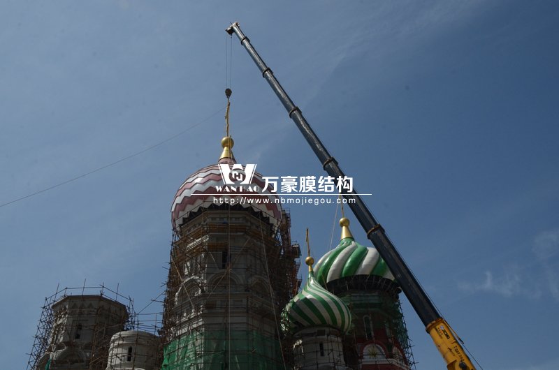 橫店圓明新園俄羅斯館屋頂整體吊裝順利完成,300多噸的大吊車,20多噸重的鋼結(jié)構(gòu)裝飾球,80米高的作業(yè)平臺(tái),在萬(wàn)豪現(xiàn)場(chǎng)管理人員和工人的緊密協(xié)調(diào)下,經(jīng)過(guò)一周的晝夜努力終于大功告成,本次吊裝從4月17日開始,前期天氣晴朗無(wú)風(fēng),是吊裝的好天氣,吊裝也是順利進(jìn)行,之后的幾天陰雨不斷,大家為了吊裝盡快順利完成,在雨小的時(shí)候冒雨進(jìn)行吊裝,終于在4月22日吊裝正式完成。