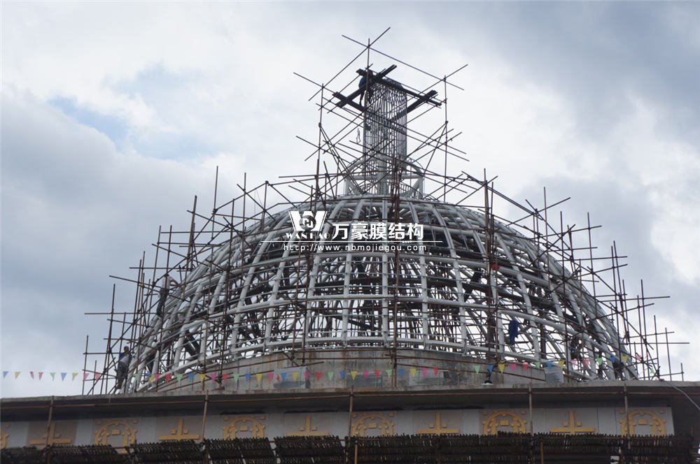 整個穹頂主結構由48根弧形鋼結構勾勒而成,外表面采用8000多塊金色鋁板拼裝完成,由于該項目為圓頂結構,每條緯線部分的每塊鋁板大小各異,因此對主結構加工、安裝精度要求極高,現場以一個平面控制網和48個徑向平面組成控制系統,即以平面代替三維空間,來達到精確、快速的測量定位及校正數據并順利完成施工。