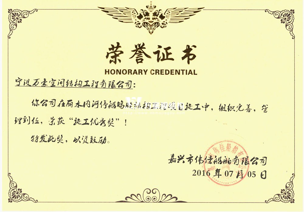 我司承建的浙江麗水內河停船塢膜結構工程項目獲得業主頒發“施工優秀獎”。