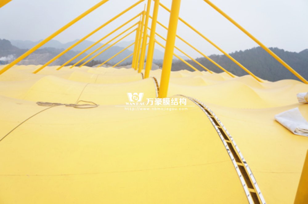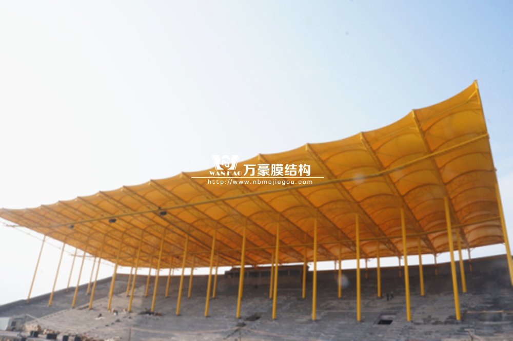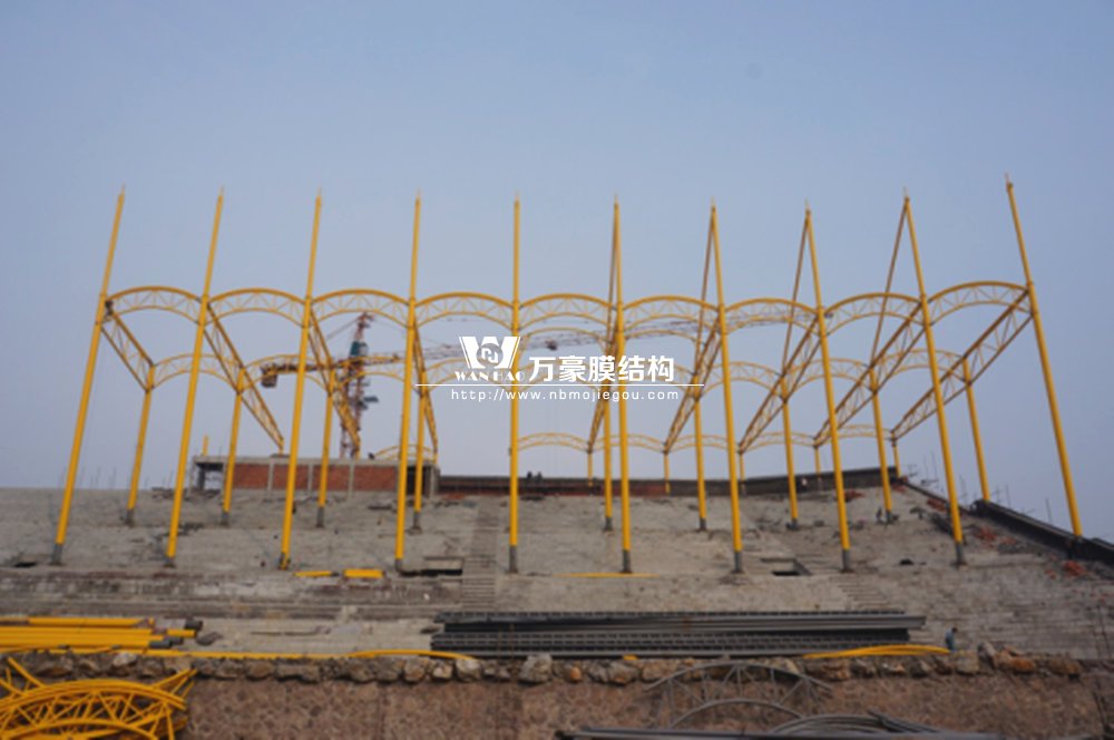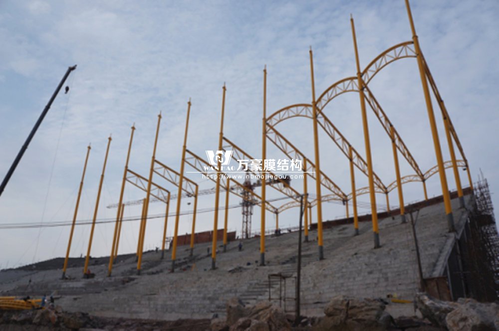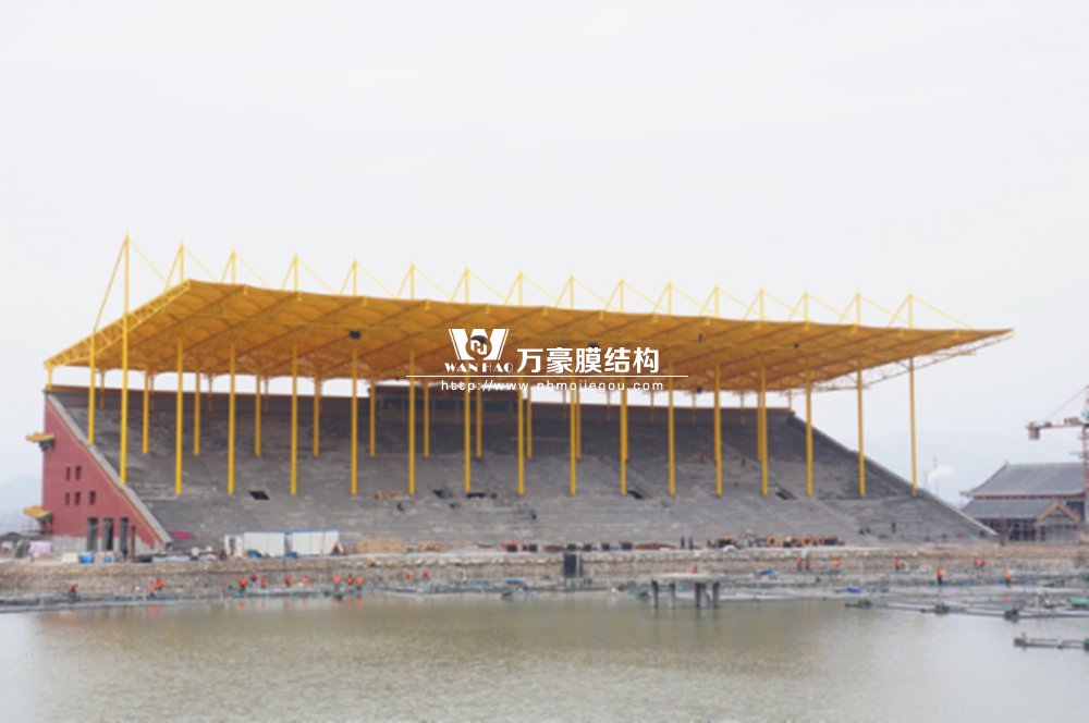 橫店影視城被一圈連綿起伏的山巒包圍著,層疊的遠山宛如水墨畫。圓明新園則位于小鎮西邊的山巒中,芳草萋萋、溪水潺潺!花仙湖膜結構看臺坐落于圓明新園春苑東北角,為骨架支撐式膜結構,建筑面積約為16000㎡,看臺主體結構可分為15個單元,屋面膜結構則由30片膜組成。主體結構劃分為四大部分:鋼柱、主桁架、次桁架和馬道。鋼柱高34.76米,單個重量達8.2噸;主桁架長70.66米,柱間距15米,看臺屋面猶如浮動的金色流云,徜徉在花仙湖上空。此項目為全國最大的“水戲”表演建筑的看臺,同時也是水上樂園彩色膜結構最大的一個景觀。