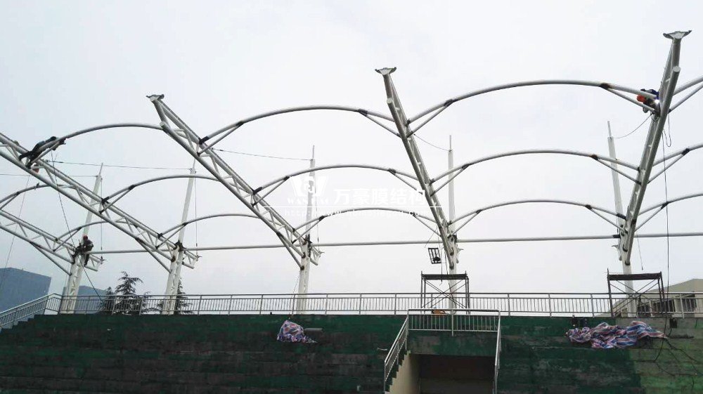 膜結構看臺決定著一個學校的形象,所以看臺設計不僅要具有可觀賞性、藝術價值、唯一性,而且還能使觀賞者與景觀產生共鳴想通。而膜結構因于其造型自由輕巧、阻燃、制作簡易、安裝快捷、節能、使用安全等優點。