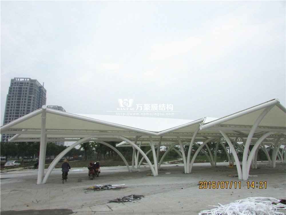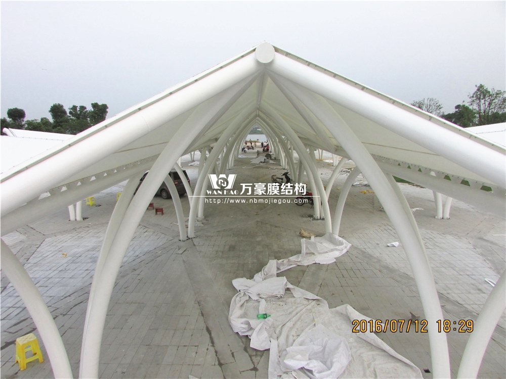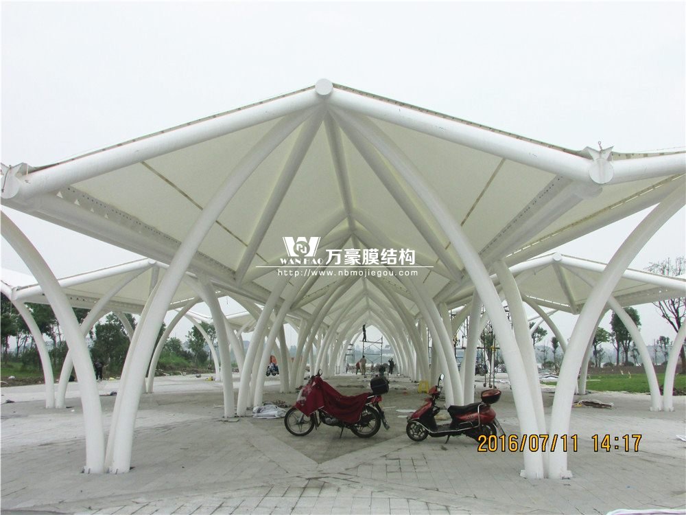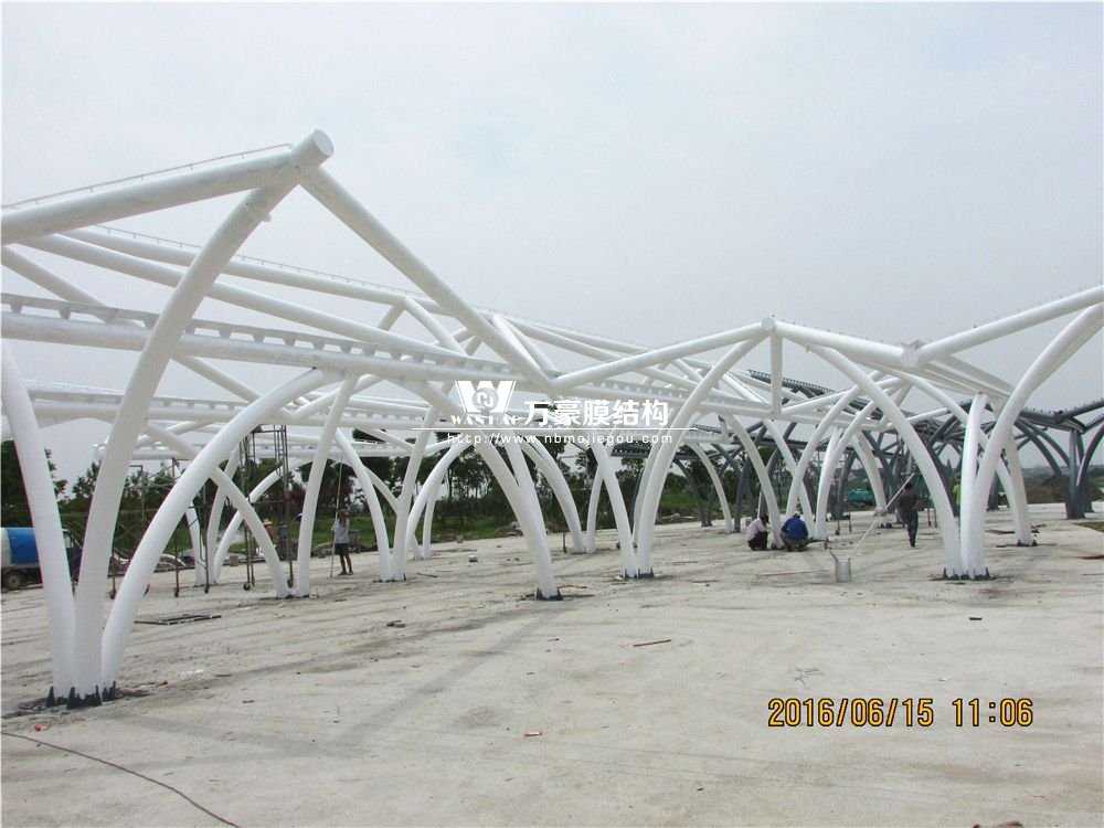 該工程由我司深化、制作及安裝,工程質量良好,該工程造型比較新穎,從高空俯視整個工程像一架飛機停在廣場上。該工程鋼結構骨架由各種彎弧圓管柱和直管梁組成。屋面覆蓋PTFE膜,中間膜體單元最大為32m×10m,邊膜20m×10m。該工程基礎隨著廣場地面有一定坡度,中間高,四周低。完美的造型勢必會帶來施工的困難,我們的團隊頂著炎熱酷暑,投入大量的人力資源,終于如期完成此項工程,收到當地市民的極力贊揚!為百姓休閑納涼帶來了方便舒適!