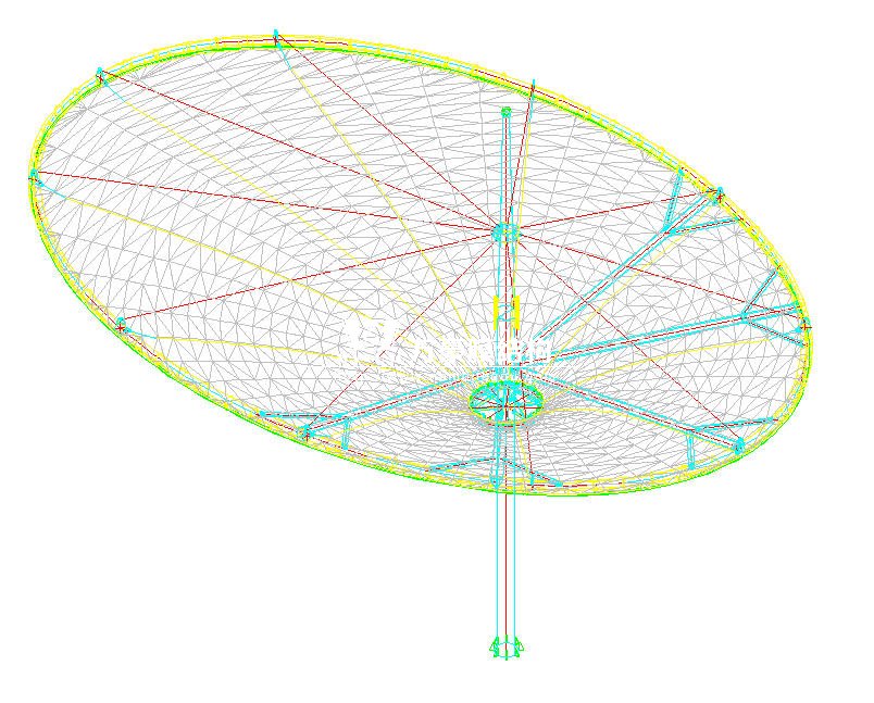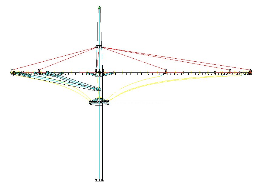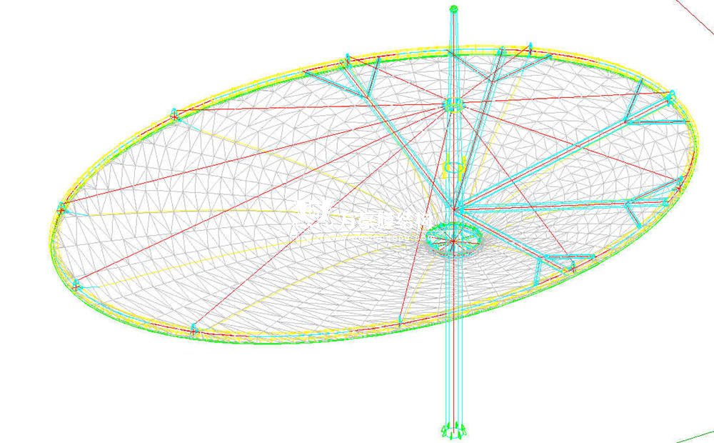 主要材料規(guī)格為:基礎(chǔ)為¢960*20柱腳底板,主立柱¢700*16,中間灌C35的膨脹混凝土,錨栓為¢20,鋼架主要材料為:¢165*5、¢114*4、¢325*10、¢219*6,鋼管材質(zhì)為Q235B,鋼索采用¢20、¢32鍍鋅鋼索,采用法拉利1502t2膜材。