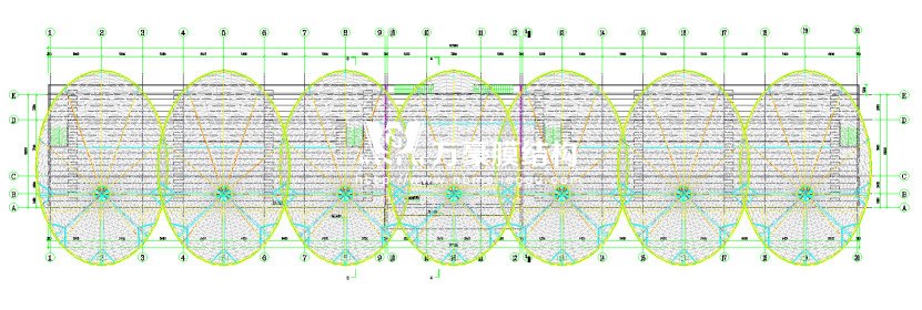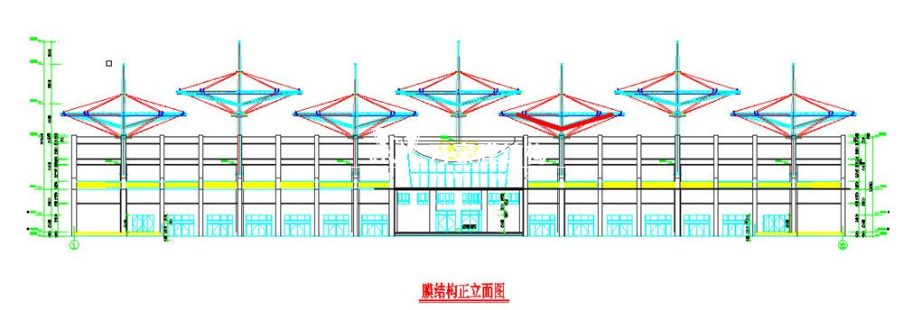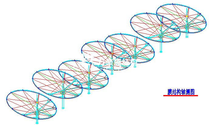 膜結(jié)構(gòu)工程簡介:膜結(jié)構(gòu)雨棚位于室外看臺A-E軸/1-20軸區(qū)域。膜結(jié)構(gòu)雨棚采用張拉索膜結(jié)構(gòu),膜材采用進口法拉利1502t2膜材,雨棚柱頂標高32.643米,由7個長30.08米,寬17.38米的倒傘形狀的單體組成。