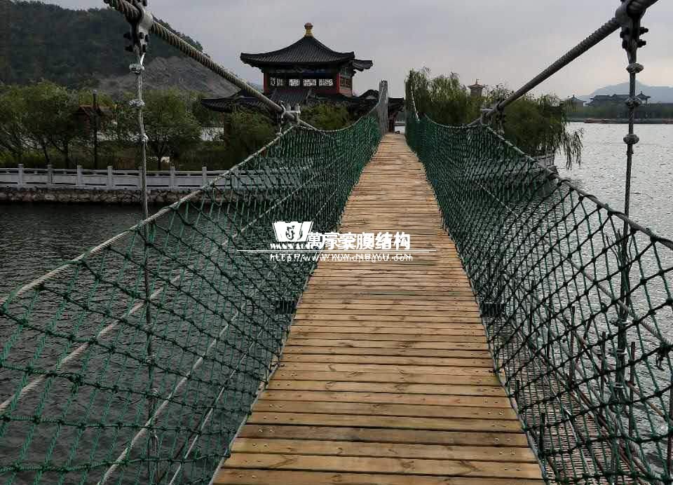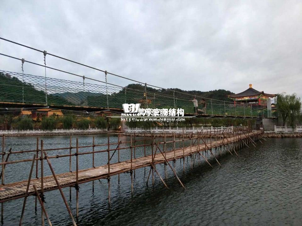 該橋采用8根柔性鋼絲繩,4支立柱作為受力構件,橋面采用組合型鋼作為支撐面,上鋪防腐木枋板。根據橋面與水位的相對高程,吊橋主跨為65m。該橋橋面凈寬度為1.5m,吊橋橋面總寬度2.0m。上鋪4公分厚的防腐木枋板。最多可承受130人行走,橋下能自由通行龍船。符合景區游客娛樂性游玩與功能性通行的完美結合在一起。