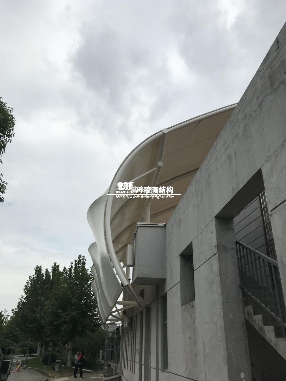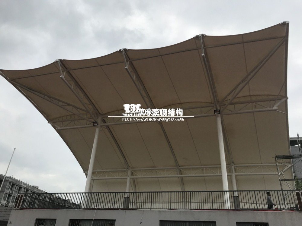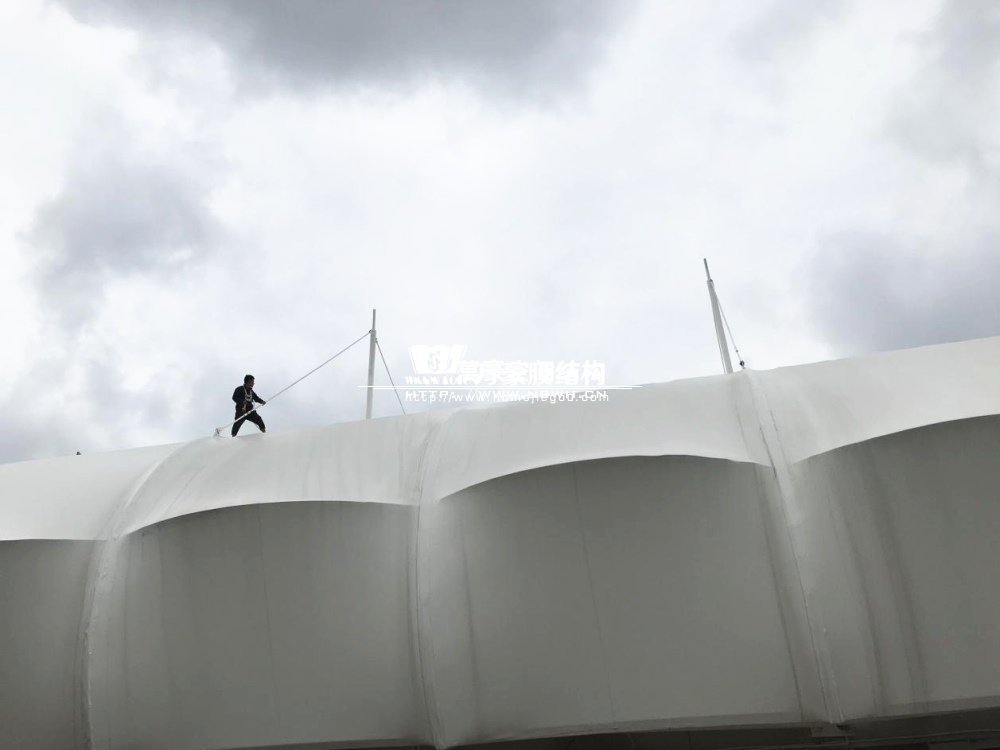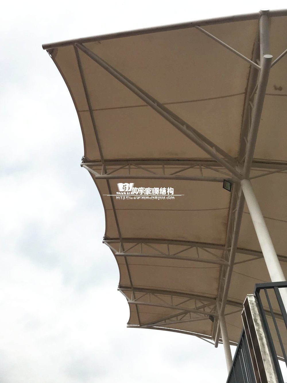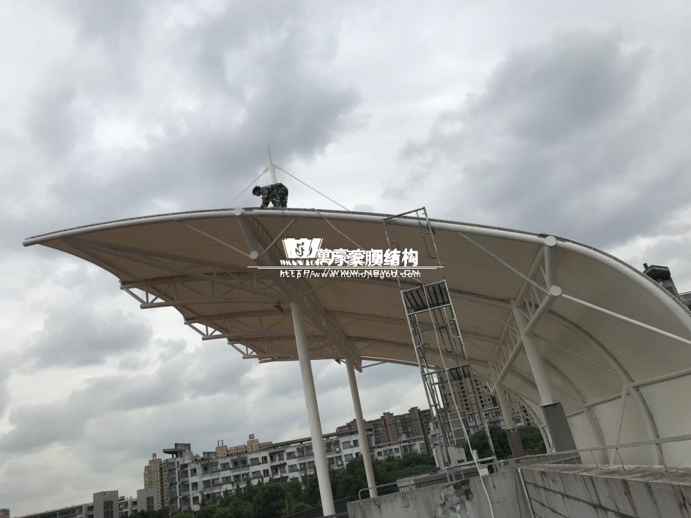 嘉善中學司令臺膜結構頂棚工程就位于嘉善縣陽光西路1228號,該工程由寧波萬豪空間結構工程有限公司深化、制作及安裝。因現場施工條件受限整體鋼結構吊裝只能從后側展開作業,對前段鋼構的施工焊接精準度提出了較高要求,鋼構件安裝位置稍后變動,膜材都可能無法順利安裝到位。由于該工程膜材的最高點高度為25米,高空作業加之膜材后弧半段回轉度較大,施工人員站在上面基本無法正常行走;鋼構最高點高達30米,因此對現場防腐工程來說又是一個新挑戰。