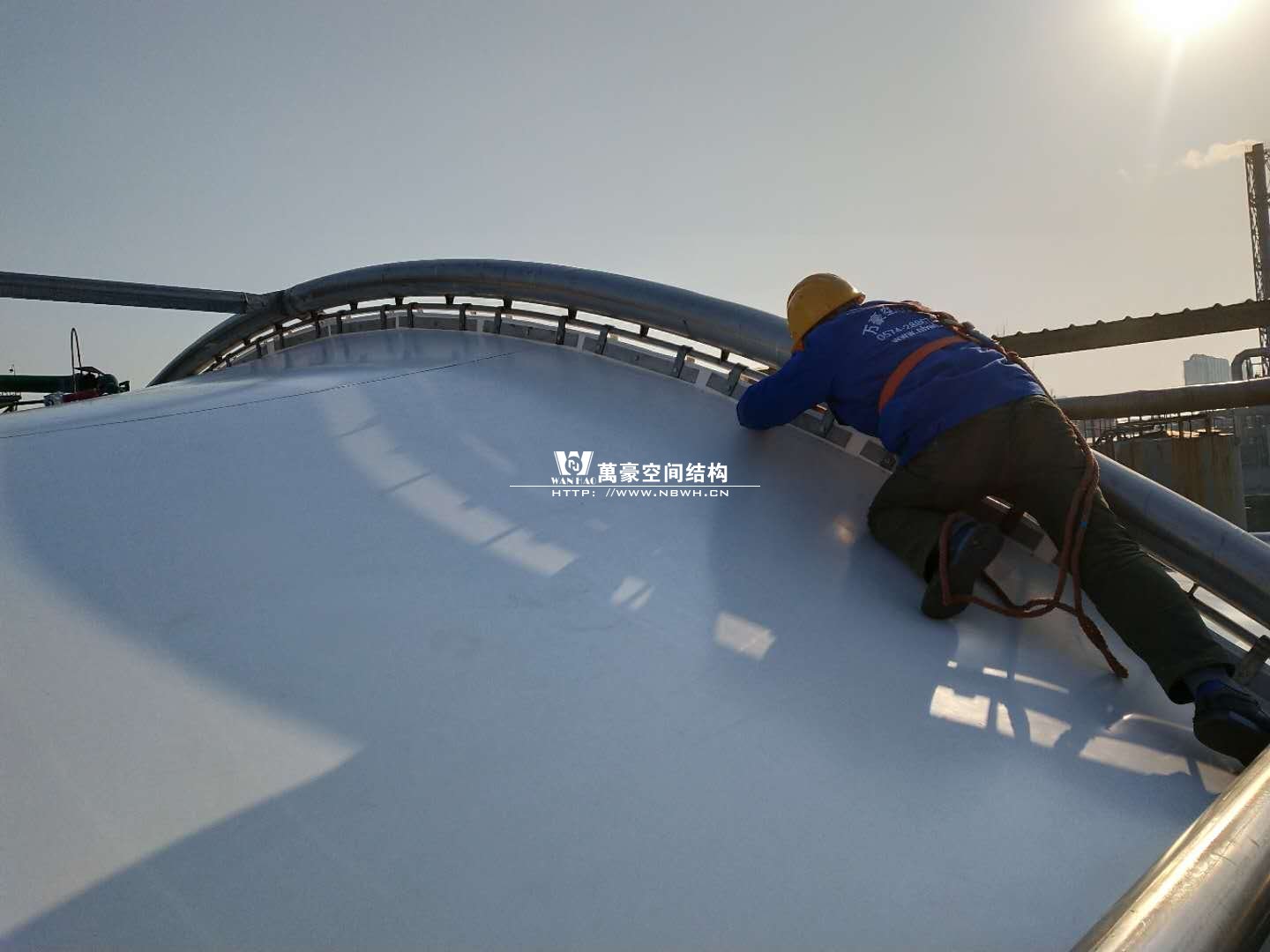 鋼結(jié)構(gòu)全部選用304不銹鋼材質(zhì),所有鋼柱與混泥土結(jié)構(gòu)連接采用注射式化學(xué)粘結(jié)螺栓-高強乙烯基樹脂砂漿。因污水池的特殊性,保證鋼結(jié)構(gòu)不予污水直接接觸,全部采用了倒掛式膜結(jié)構(gòu)。