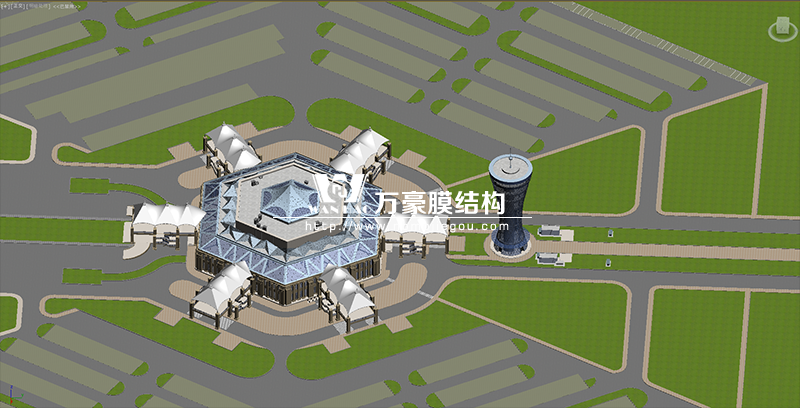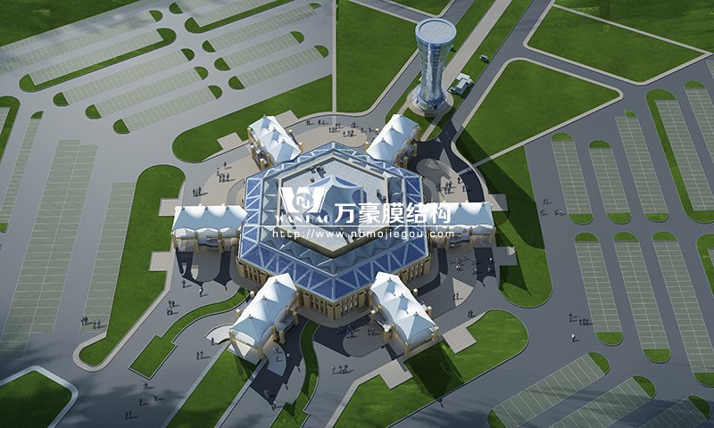 主樓屋頂為六邊形空間結構穹頂,墻面為蜂窩狀幕墻,連廊部分為具有當地文化特色造型的膜結構。