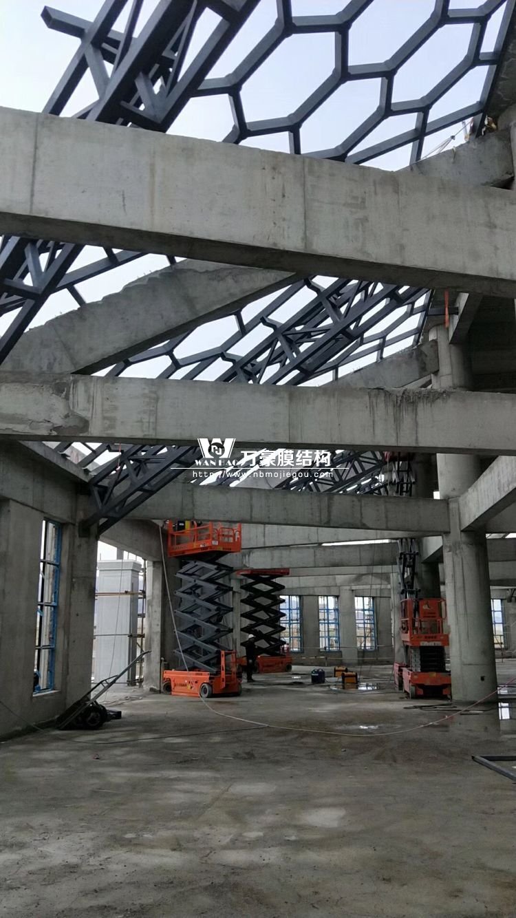 目前,主樓六邊形、二樓斜屋面每面四根大梁已全部安裝完畢,現(xiàn)在一個面的其他鋼構(gòu)正在安裝中,穹頂大梁框架完成。