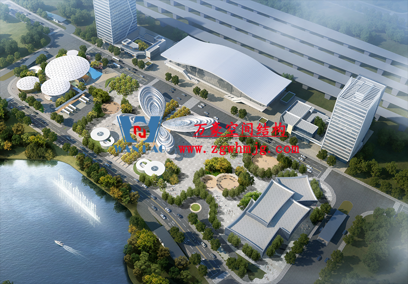本工程鋼結構為單層雙曲網殼結構體系,平面上為對稱結構,大翅膀長跨約 50m,短跨約 25m,小翅膀長跨約 35m,短跨方向約 15m。建筑頂面為雙曲造型,建筑物最高點標高約17米。總用鋼量800噸,膜體總面積約7000平方米。
