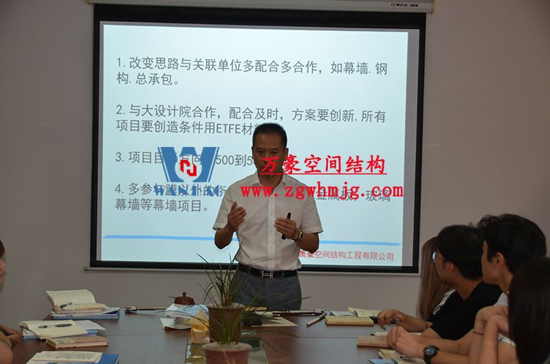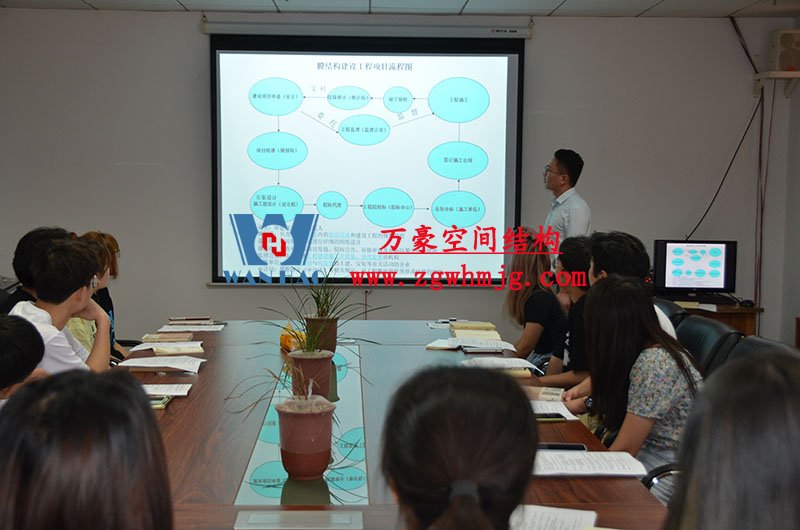 然后,我們的銷售主管教新員工們學(xué)習(xí)了公司晨會(huì)流程以及膜結(jié)構(gòu)建設(shè)工程項(xiàng)目流程。