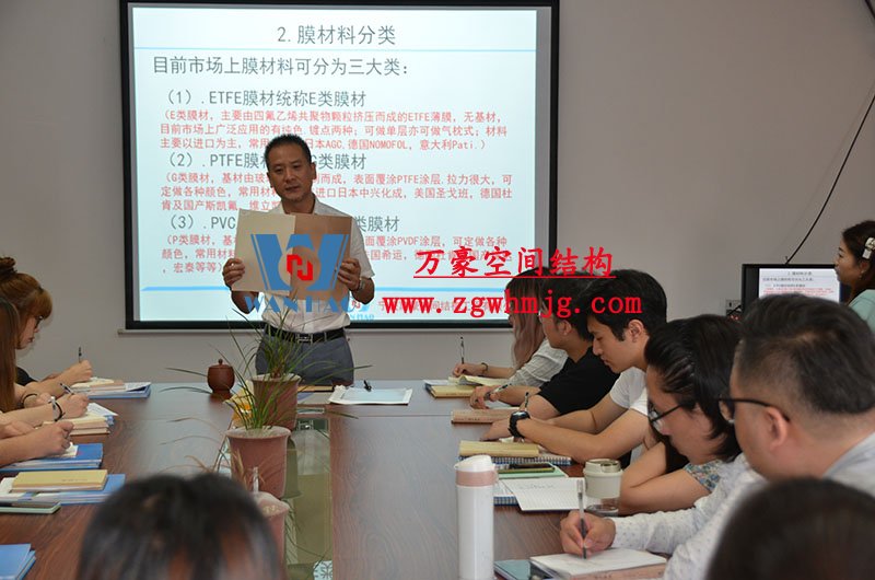 為更好的掌握膜結(jié)構(gòu)技術(shù)知識(shí),更專業(yè)的為客戶服務(wù),2021年6月25日,萬豪空間結(jié)構(gòu)對(duì)新進(jìn)員工進(jìn)行了膜結(jié)構(gòu)專業(yè)知識(shí)培訓(xùn)。