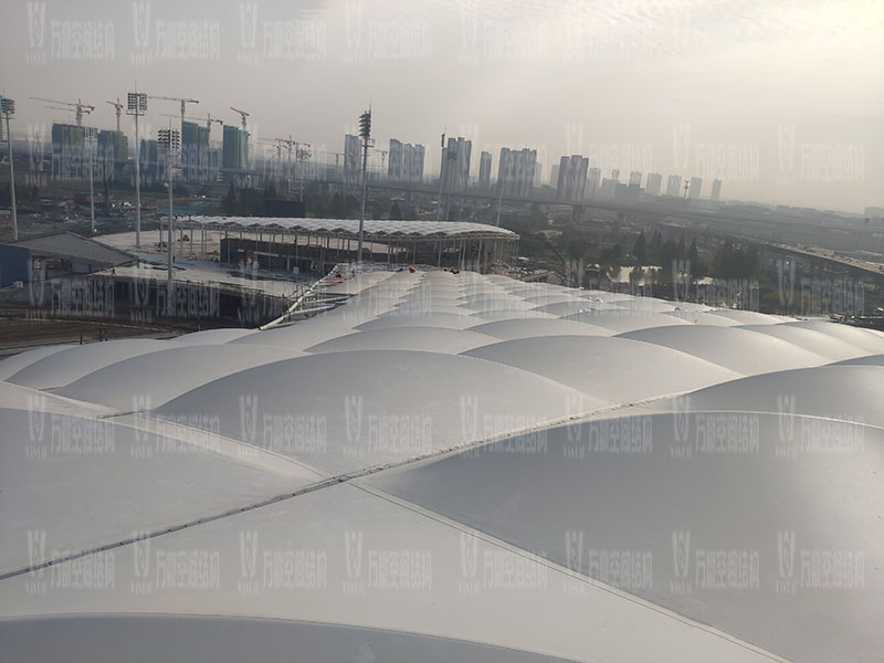 杭州亞運會棒(壘)球體育文化中心項目位于浙江省紹興市,總建筑面積16萬平方米、總投資約18億元。該項目頂部材料選用高自潔PTFE膜材,膜結構展開面積合計20000平米。