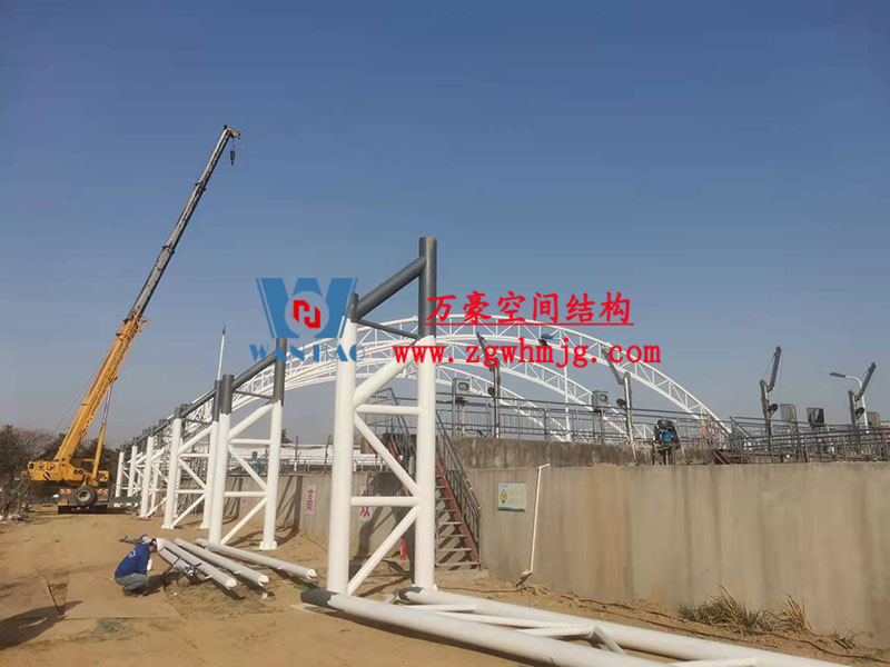目前,進水口、粗格柵、細格柵、厭氧池兩個池子鋼結構都已完成 ,厭氧池立面膜已張拉,開始裝側面膜,南區氧化溝三個主桁架完成 ,準備進行下一步施工。