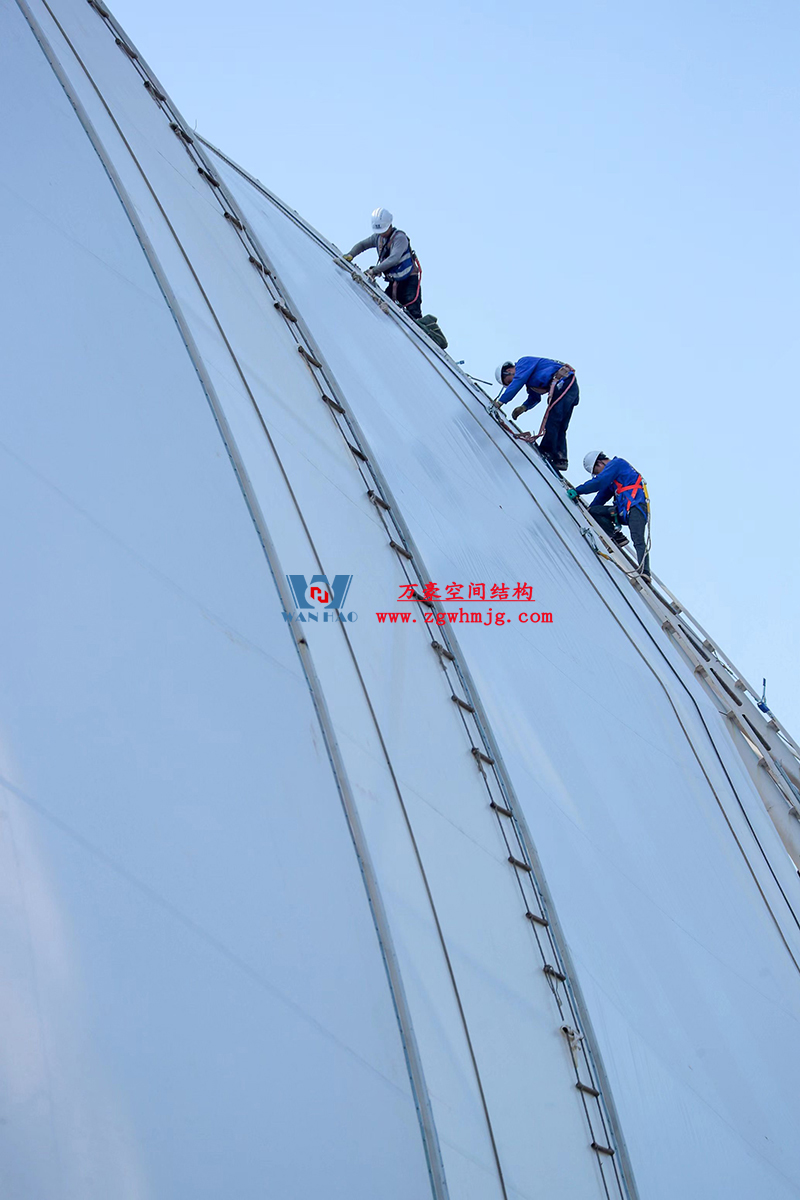 項目總承包單位中國五冶,專業分包單位寧波萬豪空間結構,儲煤大棚設計選用了大跨度空間結構設計,跨度110米,長度310米,高度45米中間無柱子,屋面選用了二種不同透光率的建筑膜材料,白天內部通透明亮,空間無死角使用,歷時近半年已建設完成,即將投入使用。