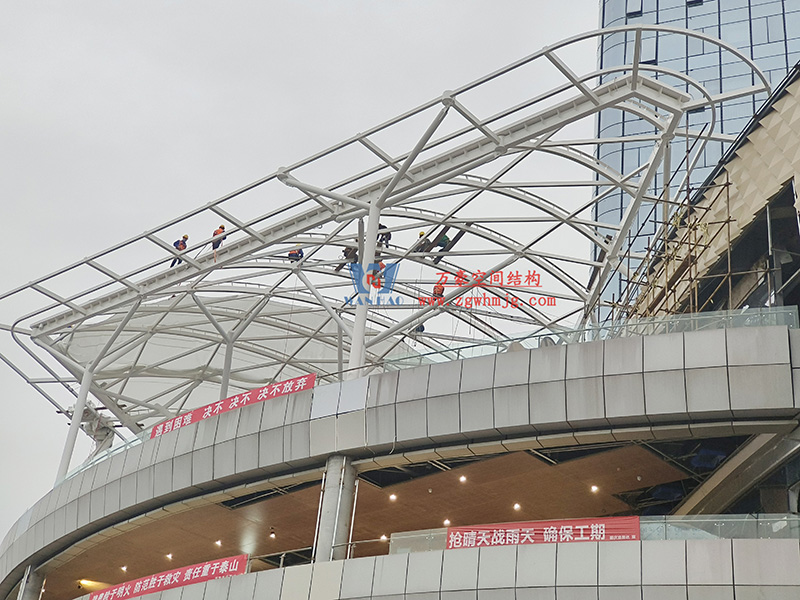 南充萬達項目鋼膜結構ETFE蓋頂天幕工程,該項目總用鋼量500噸,其中主體鋼結構400噸,二次鋼結構100噸,膜材展開面積總計13500平米,其中ETFE膜(俗稱“軟玻璃”)7000平米,二氧化鈦高自潔涂層PVDF膜6500平米。本項目作為四川省南充市萬達廣場新地標商業綜合體配套設施,建成后將成為南充市又一經典之作。