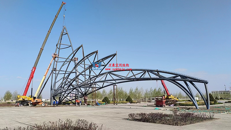 項目正在進行大門主體鋼構的拼接工作,由現場照片可以看出,主體鋼構部分的拼裝已經接近尾聲,大門的整體造型已經能夠完整的凸顯出來,后期將繼續緊抓工期節點,進入鋼結構的收尾工作以及膜結構安裝的前期準備工作。期待項目的早日完工,能夠盡早一睹項目的風采。
