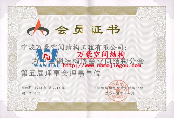 我司(寧波萬豪空間結構工程有限公司)在本次會議上榮獲“中國鋼結構協會空間結構分會理事單位”。